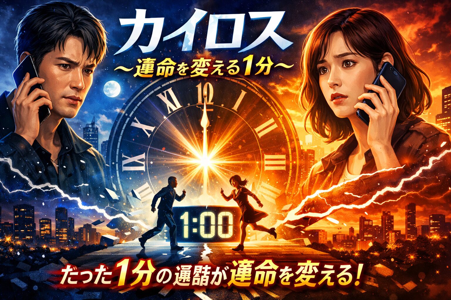<p>「カイロス(Kairos)」は古代ギリシャ語で「好機・チャンスが訪れる特別な瞬間」を意味します。「流れていく一般的な時間」を表す「クロノス」に対し、カイロスは「時が熟した決定的な瞬間」を指す言葉です。毎夜たった1分間だけ訪れる「繋がれる時間」が、まさに運命を変えるためのカイロスである──というタイトルの意味は、作品のテーマと深く結びついています。</p>